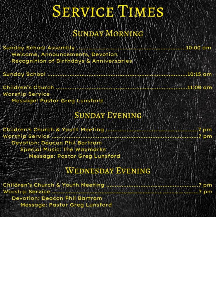 Thurs.- Fri., Oct. 19–20 – WVBC Annual Meeting, South Parkersburg Baptist Church. Our delegates are Pastor Greg Lunsford, Jim & Jo Ross, and Patty Morrison.