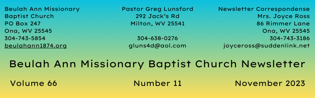 Pastor Greg, Jim and Jo Ross, and Patty Morrison attended the annual meeting at South Parkersburg Baptist Church Oct. 19-20. Patty and I attended Women’s Day Thursday morning. The sanctuary was beautifully decorated with white flowers and white pumpkins. Missionaries to South Africa, Rick and Anita Guiterriez, who are both doctors, gave a wonderful presentation on how they build “domes” out of PVC pipes with covers, in which the people, mostly Zulus and Indians who have migrated there, learned to grow fruit trees, raise chickens, and many other uses for these structures. We learned what our ABWM projects will be for 2024, and elected officers, and heard an inspiring message from Clare Cottrill. We were asked to bring lots of coins for a “noisy” Love Gift offering. The offering was taken up in metal containers then dumped into a bigger metal container, and it was really noisy! A bank counted it during our lunch, and the total was $1,573.40! A big change was announced concerning Love Gift, and our officers recommended a new name for it, “WV Blessings.” The whole offering will stay in WV. Thirty percent will be for WV ABWM, and 70 percent for WVBC. We gladly approved this motion.