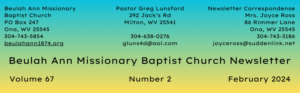 NOTICE: If you need a tax statement of your church giving in 2023, please contact Financial Secretary Brenda Lawson, or call the church at 304-743-5854, and we will give her the message.