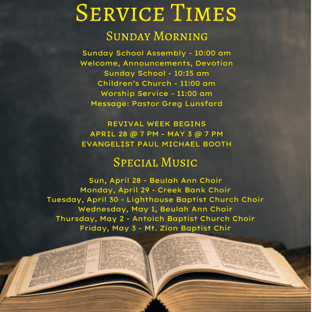 Children’s Church will meet Sun. April 28, and Wed., May 1, at 7 pm during Revival.