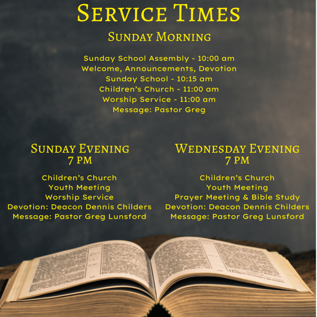 Sun., Aug. 11, 6 pm – Simon Morrison, Pastor of Mud River Baptist Church (our “Mother Church”) will speak and his congregation will join us. Fellowship reception after.