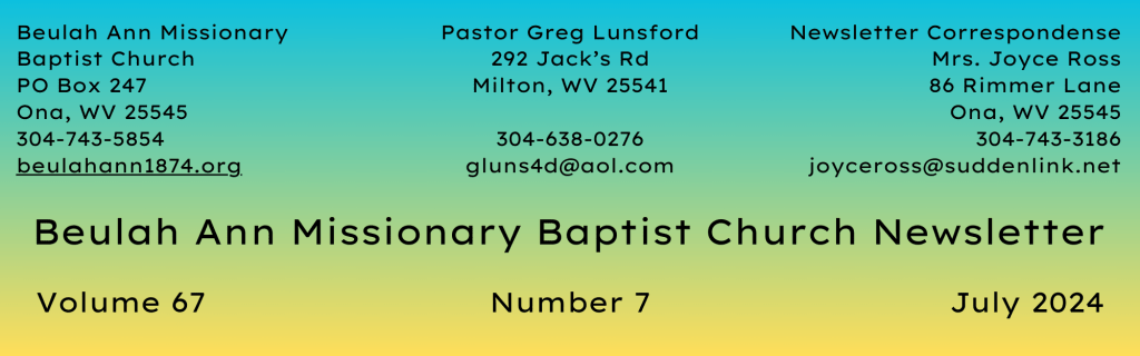 Sun., Aug. 11, 6 pm – Simon Morrison, pastor of Mud River Baptist Church and who was raised in this church, will speak. Mud River is our “Mother Church.” Their congregation will also be worshipping with us, and we will have a fellowship reception after service. (Note the service time change!)