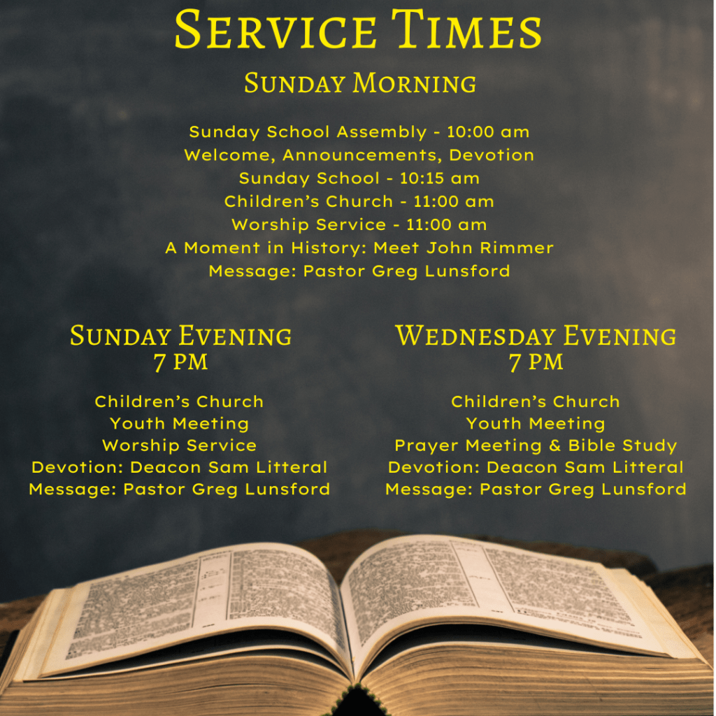Sun., Aug. 11, 6 pm – Simon Morrison, Pastor of Mud River Baptist Church (our “Mother Church”) will speak, and his congregation will join us. Fellowship reception after. (Please note service time change.)