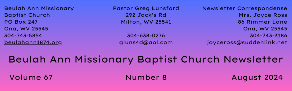 What a wonderful fellowship we had Sunday night, Aug. 11. Pastor Simon Morrison of Mud River Baptist Church, was our guest speaker. Simon grew up in our church and was saved in the “old church” at the age of seven. He shared with us many memories. He recounted how John Rimmer would greet everyone with a big handshake slap, and if you were a child, you would end up with a bubble gum in your hand. He had memories of Luther Morrison, Mary Lou Elkins, Viola Adkins, Oliver Beckett, Elsworth Markin, and others.