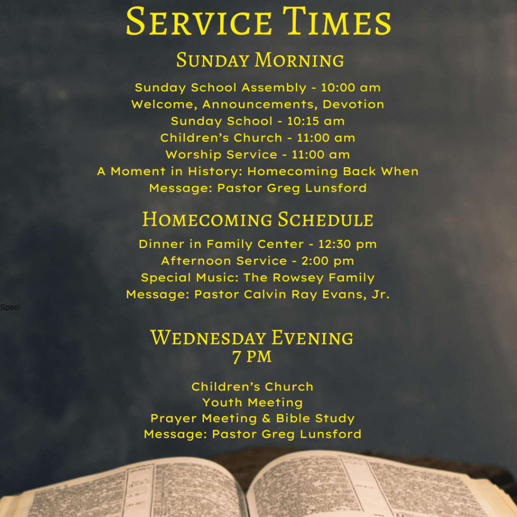 Sun.-Fri., Oct. 13-18, 7 pm – Fall Revival with Pastor Jeff Fetty.