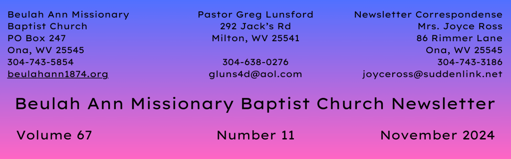 Tom and I were privileged to attend the WVBC Annual Meeting Oct. 17th and 18th at Calvary Baptist Church in Oak Hill. It was two days filled with singing, preaching, reports and praise. We attended the Baptist Campus Ministries (BCM) dinner Thursday night and learned that BCM is growing and thriving on 9 college campuses in WV. Students from BCM at WV Tech in Beckley and Concord sang and spoke. We also attended the WV Baptist Historical Society Luncheon on Friday. Several churches were honored for having 100 or 125 year anniversaries. Beulah Ann was one of two churches recognized for 150 years. Gary Higginbotham gave an incredible portrayal of John Alderson, Jr., one of the founders of the Greenbrier Association in the 1800s, and the struggles the founders faced.