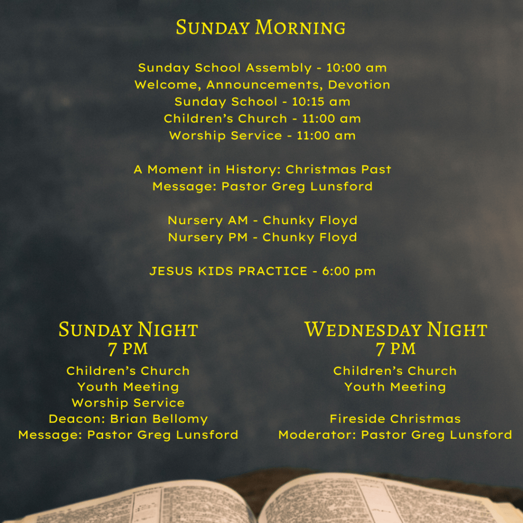 Wed., Dec. 25, 7 pm – Fireside Christmas Service, in the sanctuary. Come prepared to share a Christmas memory, poem, or your favorite song. (There will not be any nursery or children’s church.)