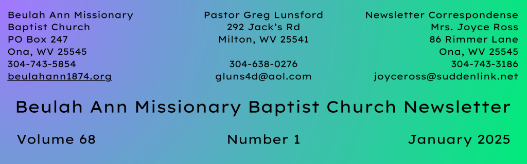 If you need a report of your tithes and offerings for 2024 for your tax return, please contact Brenda Lawson. You can call the church and leave a message at 304-743-5854.