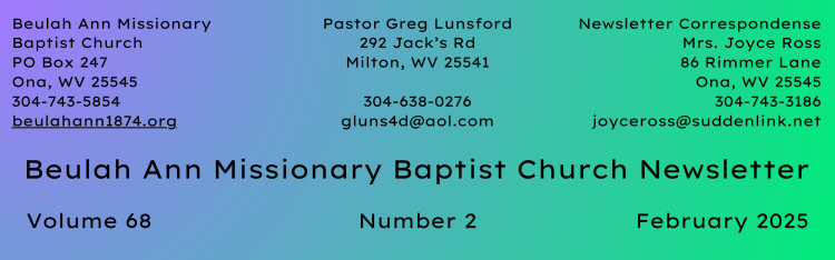 NOTICE: If you need a report of your tithes and offerings for 2024 for your tax return, please contact Brenda Lawson. You can call the church and leave a message at 304-743-5854.