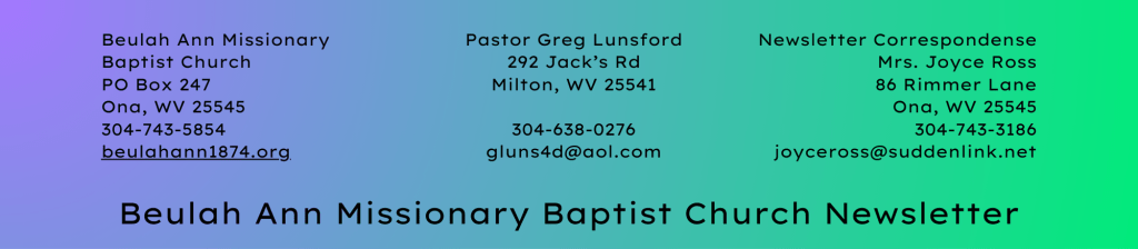 NOTICE: If you need a report of your tithes and offerings for 2024 for your tax return, please contact Brenda Lawson. You can call the church and leave a message at 304-743-5854.